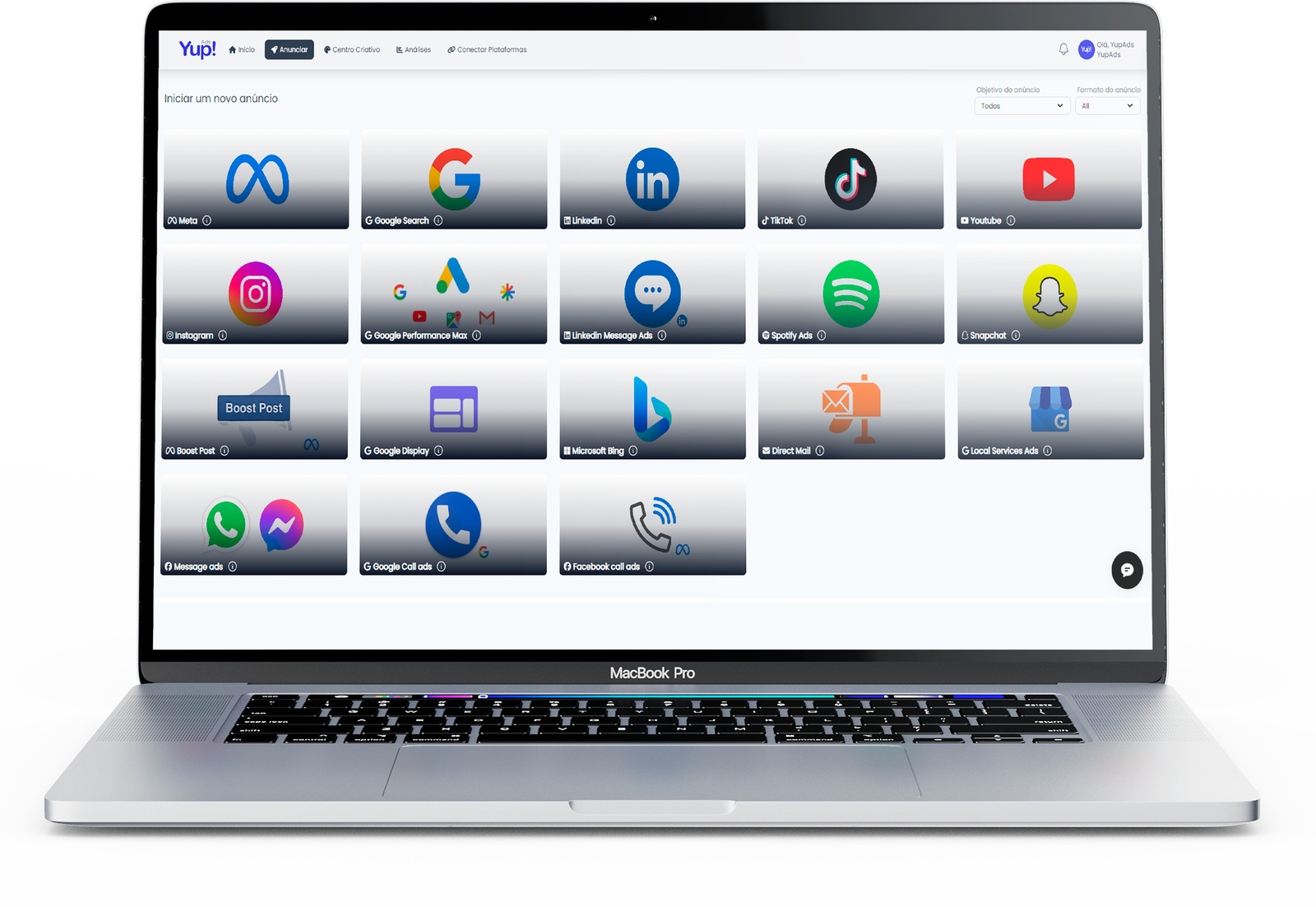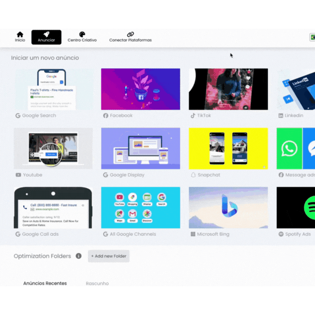 Gerencie as principais plataformas de anúncios em um único lugar. Crie campanhas rápidas e eficientes com o poder da inteligência artificial, em poucos cliques.